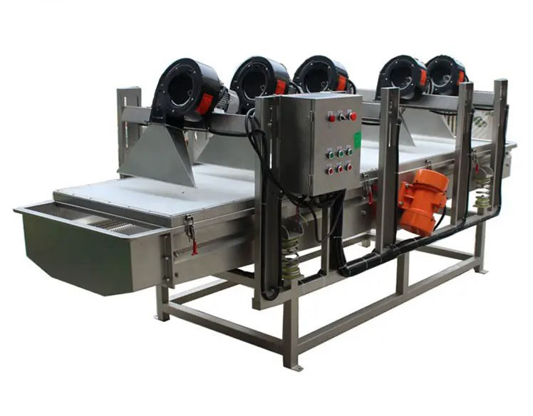 9、玉米风干沥水机,是高温杀菌后需要用平行的网带输送,不能翻转,防止在翻转的过程中,玉米袋破裂,也可用手工擦拭,通过风干沥水机常温风刀式吹包装袋的表面,可有效的将玉米包装袋上面的水珠吹掉,方便后期贴标,装箱